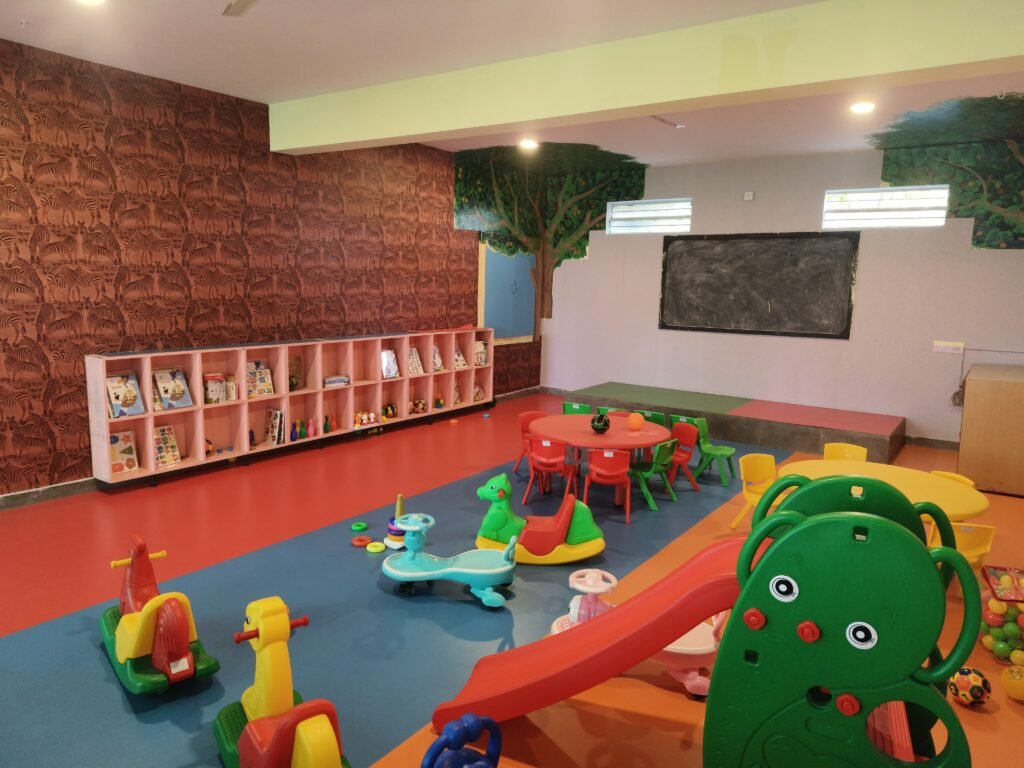 • Playground Equipment: Slides, swings, seesaws, climbing structures, and sandbox for physical activity and motor skill development.